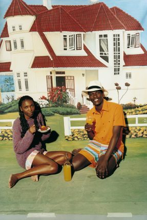 Philip Kwame Apagya (1958) is a Ghanaian artist whose color photographs reflect a contemporary twist on traditional West African portraiture. After a period of apprenticeship in his father’s studio, Apagya worked for years as an itinerant photographer in the Ivory Coast. After his graduation in photojournalism at the Ghana Institute of Journalism in Accra, he started his own studio (PK’s Normal Photo Studio) in Shama (Ghana), in 1982. In Apagya’s photos, subjects interact with his brightly painted 2-D backdrops, interiors and exteriors that catalogue the trappings and accoutrement of an affluent international culture.