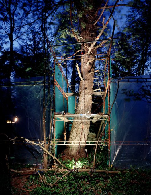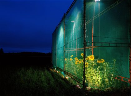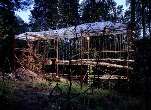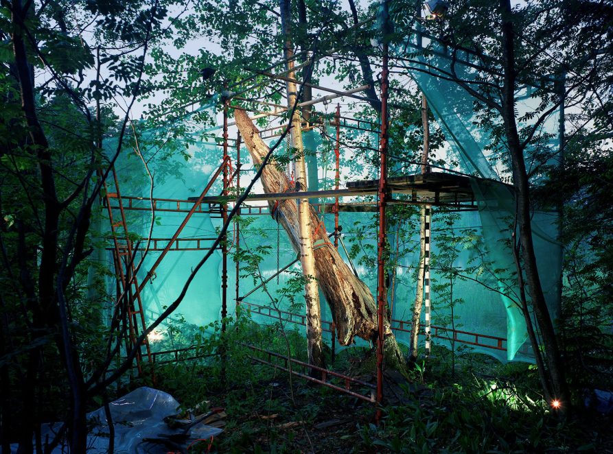 Ilkka Halso makes fun of the renovation of the ruined nature, caused by man himself. He built fictional locations where old churches or houses are not restored, but trees, fields and rocks. By literally scaffolding these natural objects and using artificial light, they are isolated from their surroundings and the artificiality of human intervention in nature is emphasized – even if there are good intentions behind it.
