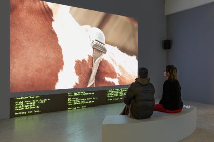 Set on a Dutch dairy farm, the work follows three cows—Aergentina 4, Margot 104, and Robina 117—equipped with neck-worn sensors called wearables. These devices collect data that directly influences the pacing and scenes of the film. The cows themselves shape the narrative. The piece reveals how dairy farming is transformed by agritech—technology used in agriculture—such as milking robots and data-driven tools that track animal performance through KPIs (key performance indicators). Waiting for Cows is presented as a cinematic meditation that raises questions about care, control, and kinship in a world where animals and machines are deeply interconnected. It offers a rare, intimate view into the routines of today’s automated farm life.