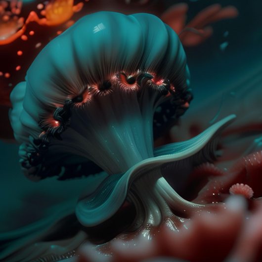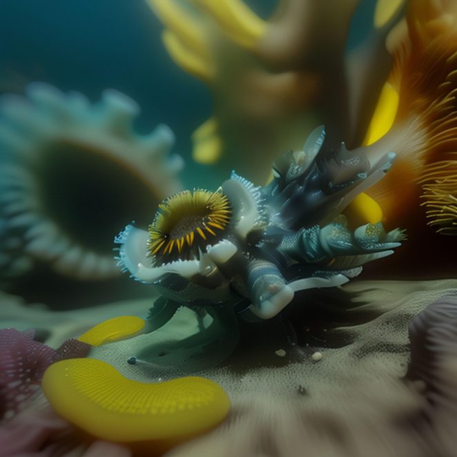 He sees the ocean as a space of change and cooperation, where all creatures are deeply connected. Using artificial intelligence (AI), Mendez creates new hybrid beings—part machine, part animal or plant—shaped by algorithms. Inspired by surrealist art and Jacques Cousteau’s ocean documentaries, his images evoke a dreamlike world full of strange beauty. He also draws from Theo Jansen’s “new nature,” known for wind-powered walking sculptures made from plastic tubes. Mendez doesn’t try to show a clear future, but instead explores possibilities: what happens when natural ecosystems disappear? How might life look in a world shaped by both humans and machines?