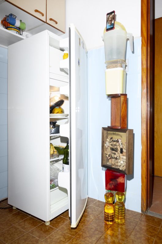 They playfully refer to the Latin American gambiarra way of thinking, where people invent clever solutions with minimal means. In the empty spaces of the photographs, human figures appear only as blurred reflections on screens, silent witnesses to our digital existence. The makeshift “totems” show how people try to keep their screens visible while cooking, cleaning, or falling asleep. With a playful wink, Sánchez reveals how precarious the relationship between humans and machines is.