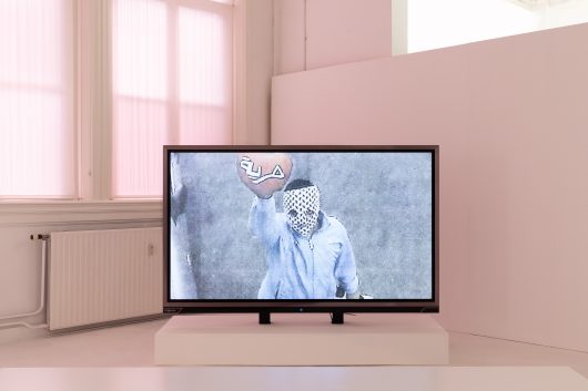 The second work, ‘A Protester in Homs, Syria’, is an endlessly slow zoom in on the face of one of these protestors. A voice-over narrates the photograph’s three stages of movement: the journey of the image from Homs in Syria to the front page of the newspaper, the relationship that subsequently develops between the reader and the protester, and the power relations that revolve around visibility. At the end of the zoom, the image rests on the face of the protester in the photograph, which eventually becomes illegible and dissolves into the inkblots of the newspaper print.