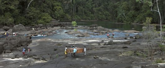 The hybrid documentary film project by Dutch artists Lonnie van Brummelen and Siebren de Haan and the Surinamese theatre maker and poet Tolin Alexander bridges filmmaking, poetry and theatre. The Maroons demonstrate rituals to get in touch with their ancestors and local forest spirits and express how their ties to their ancestral grounds land have become endangered as industries devastate the region through deforestation and mining.