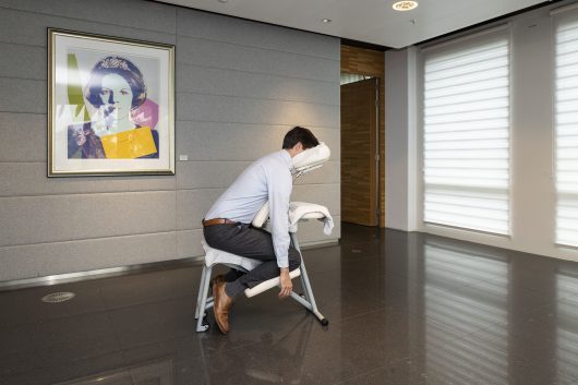 Photographer Nick Hannes went to the head offices of a number of banks and financial companies in The Netherlands and Belgium to depict office life in a documentary way. He pays particular attention to the spatial aspect and contemporary office design. Taylorist offices with tight rows of desks are only known from films nowadays. The organic office islands of the 70s evolved under the impulse of digitization to modular systems and clean desk policy. Glass partitions stand for openness and transparency. The new workplace is social, flexible, comfortable and technological. There are informal meeting rooms for brainstorming, telephone capsules for more privacy, playrooms and intimately lit lounges for relaxation, and quiet places to concentrate. Office furniture is fashionable, homely and ergonomic. Company restaurants offer healthy meals and corporate mindfulness is on the rise. There is fitness, a prayer room and art on the wall. Well-being in the workplace is important in a time characterized by stress and burn-outs.