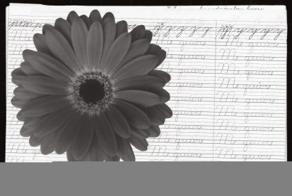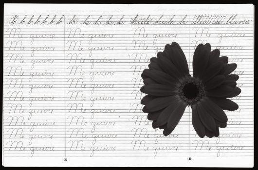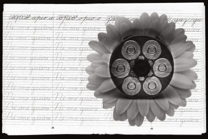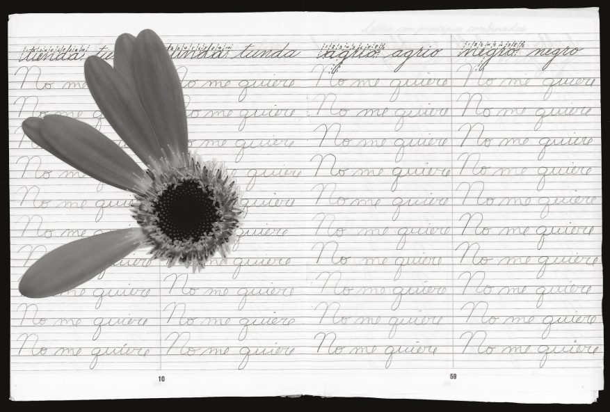 Central to the series ‘Vida Tus Espinas’ (Thorns of Life) are human relations and their effects on the personality. Irene Torrebiarte (Guatemala, b. 1970) shows in symbolic ways how people subconsciously continue to protect themselves when they begin a new relationship. The series ‘La Tarea’ consists of leaves from a school notebook. The petals of flowers are counted off onto the text ‘He loves me, he loves me not’, while the heart of the flower changes into the barrel of a pistol.