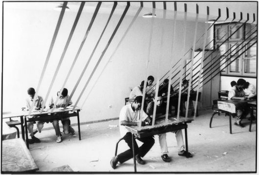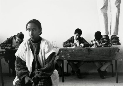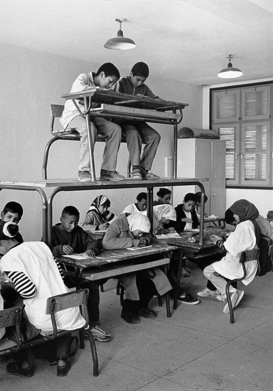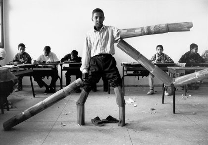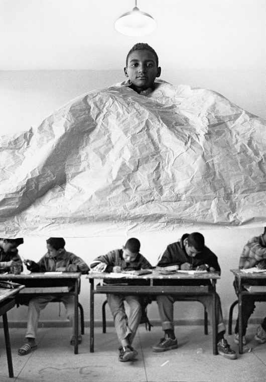 Hicham Benohoud is an instructor in visual arts in Marrakech. For LA SALLE DE CLASSE he would ask one of his pupils to interrupt their work at a random moment and pose for him. For this they had to take an unorthodox pose and could make use of all the props that were present in the classroom. After posing the pupil could continue with work. The result is a series of remarkable photo portraits in which the pupils were forced to find a new demeanour in relation to their instructor. The surrealistic character of the portraits is strengthened by the fact that while the photos were being made, the rest of the class had to continue with their work.