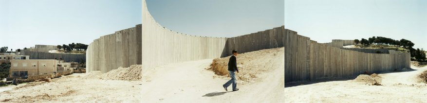 According to the Palestinian photographer Noel Jabbour, the Abu Dis wall built by lsrael on Palestinian territory, has consequences for both sides. On the one hand, the wall acts as a prison for the Palestinian people, who must try to develop in this suffocating situation. On the other the Israelis also lose a lot because of this wall. Are they not equally its prisoners asks Jabbour? She incorporates her critique in a photographic triptych. To the left we see what she calls the ‘inside’ of the wall, or the Palestinia side. To the right is the ‘outside, or Israeli side. A young man appears to sit imprisoned in the middle. For Jabbour the wall is the expression of the total failure of the Israelis and the Palestinians to share the ground – of enormous cultural and religious significance – and live peacefuly side by side.