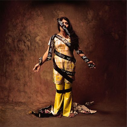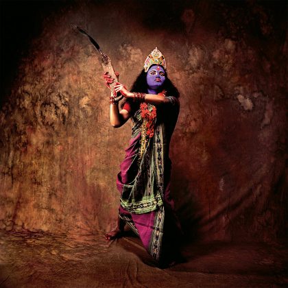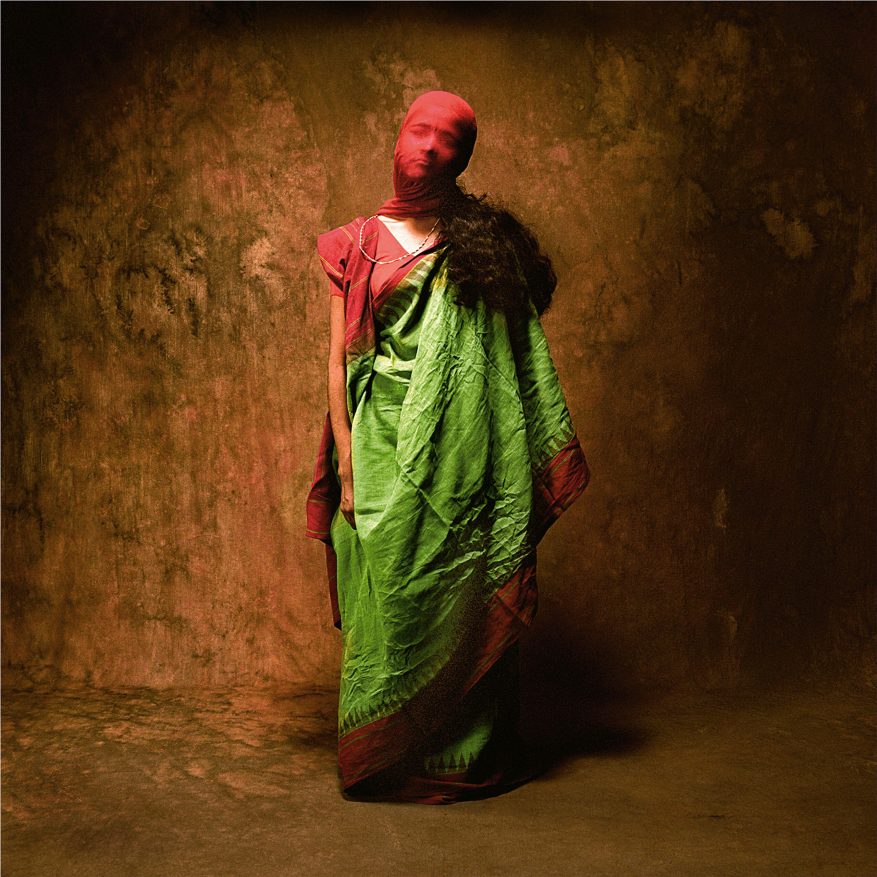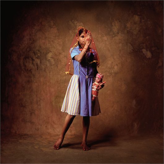 The subjects of MASKED PORTRAITS (2005) are young Indian women who have been rescued from human trafficking. With the aid of clothing, poses and objects they represent their life in the past, that was permeated with deception, abuse and violence. In order to hide their identity, the women choose a character from the world of religion, mythology, folklore or television. For instance, we see elements of the housewife, Hindustani woman and Bollywood starlet, symbols for tradition, religion and beauty. At the same time, the masquerade represents the great change that the women have undergone with respect to their earlier lives.