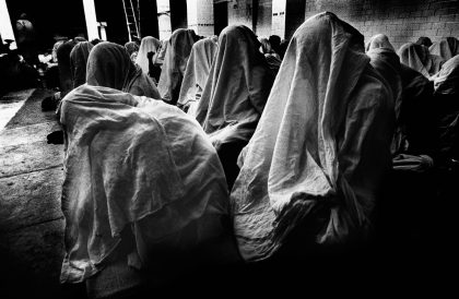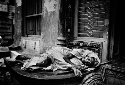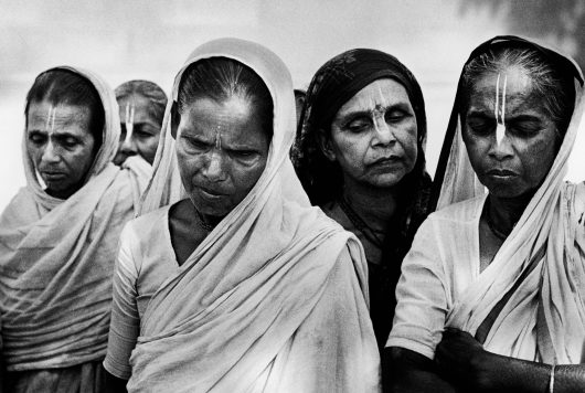 Despite social reforms, the position of widows in India is abominable. Often they are cast out by their family, who regard them as guilty of their husband’s death. Moreover, in some Indian states they are expected to shave their heads, dress like a ghost in a white sari, and live out their lives in poverty. Often they travel to the holy cities, which as seen as the links between heaven and earth. Dying there offers a chance to break through the cycle of reincarnation and achieve moksha, spiritual liberation. For instance, there are more than 3000 widows in the holy city of Vrindvan. They live packed into small rooms, without water or electricity. They try to make a living singing daily in temples devoted to the Hindu god Krishna, often for eight hours at a time. The temples receive large gifts, the windows only a pittance, so that the BRIDES OF KRISHNA (2003-2005) have to beg to supplement their income.