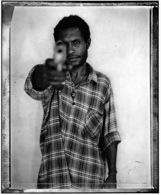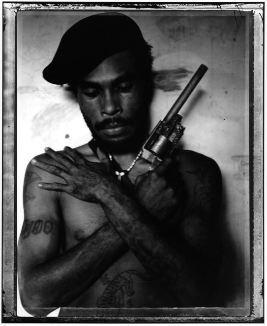 According to the financial paper The Economist, Port Moresby, capital of Papua New Guinea, is the world’s least livable city. Two-thirds of the residents live in slums; seventy percent are unemployed. The city is a spawning ground for RASKOLS (2004), street gangs that rob and plunder. The proceeds go to their own community. Stephen Dupont photographed one of the oldest gangs, the Kips Kaboni or Red Devils. The members themselves decided how they would pose, often as tough guys. In this way Dupont emphasizes the dignity of the raskols. In his eyes, more than anything else the gang members are victims of the crisis in their country, and Robin Hood figures of a sort.