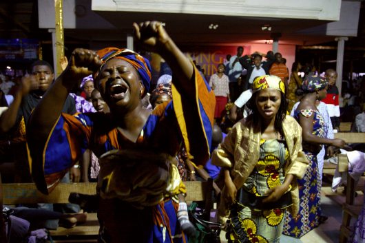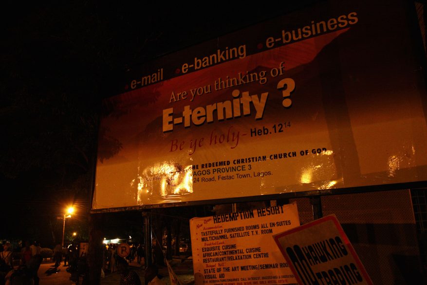 God is never far away in Nigeria. Religious buildings and symbols are found everywhere. Andrew Esiebo photographed the Redemption Christian Church of God. This movement is found chiefly along motorways, a new trend in Nigeria. The services run through the whole night, and are dominated by prayer, trance and calls for financial donations.