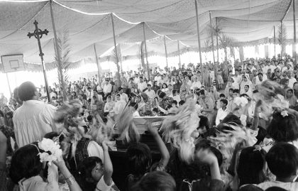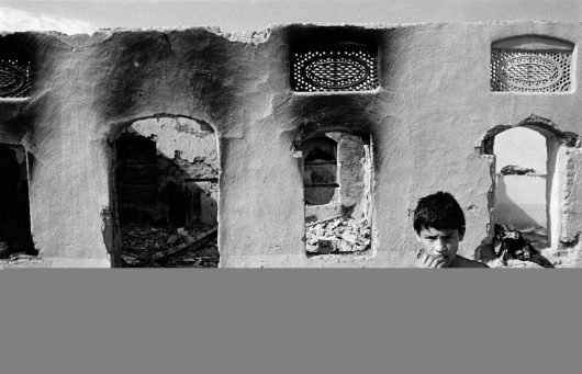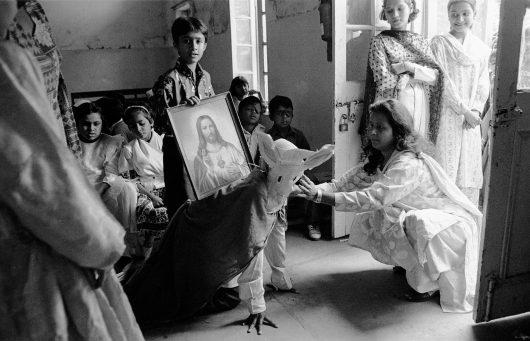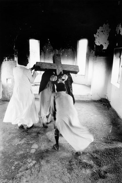 In Pakistan Christians suffer under Islamic terror. Among his subjects, Piers Benatar photographed a village in Punjab that was destroyed by Muslims. Here religion was an instrument in the struggle for land. For Benatar, the oppression of Christians in Pakistan can stand for religious intolerance anywhere in the world. Iran, Afghanistan, the United States or the Arab world: nowhere do religious dogmas leave space for other views or interpretations. Benatar photographed Christians in Pakistan precisely in order to have his message come across more sharply in the overwhelmingly Christian West. – Shanti Nagar, Punjab. The stone cross that was broken off the church by the Muslims who attacked it is dragged inside by the pastor and a pair of boys, in preparation for the evening Mass.
