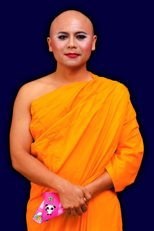 Thailand has a reputation for being open to all sorts of lifestyles. To be admitted to Buddhism, one need only answer the question, ‘Are you human?’ The question refers to a myth in which a snake god disguises himself as a man. Presently the question is used chiefly to exclude the lame, mentally ill and homosexuals. Michael Shaowanasai tested this by photographing himself made up as a Buddhist monk. The result was a heated outcry. Buddhists tried to block the exhibition, and Shaowanasai responded by showing the photograph rolled up. Subsequently he made a photograph of himself as someone who had just left the monkhood. According to the artist, the attitude of Buddhists is all the more hypocritical because closeted homosexual monks are much sought after for designing temples and organizing funerals in Thailand, because of their refined taste.