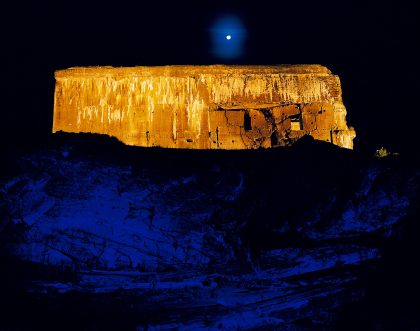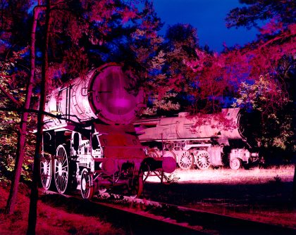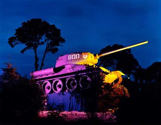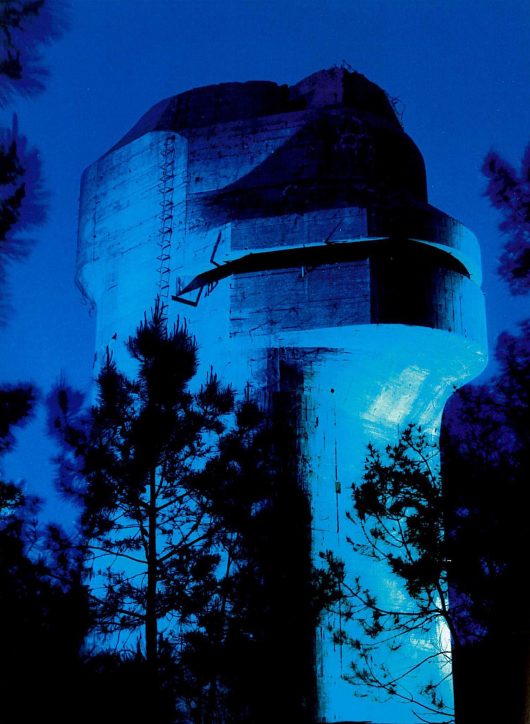 Along the coast of Europe, from Germany to the Spanish border, there are still traces of the Atlantic Wall to be found today. Presently elements of this defensive line built by the Nazis serve primarily as pissoirs for beach walkers and repositories for their discarded beer cans. Erasmus Schröter lighted a number of these half-hidden bunkers with coloured theatre spotlights, lending them a mysterious beauty, and making them the centre of interest. Later, in the forests of East Germany he stumbled on material that the Soviet Army had left behind in its hasty retreat in 1990. Abandoning tanks, barracks and aeroplanes was cheaper than dismantling them or taking them with them. Schröter handled these objects in the same manner as he had the bunkers of the Atlantic Wall. In this way socialist kitsch and weapons become historic sculptures, made by underpaid Soviet soldiers.