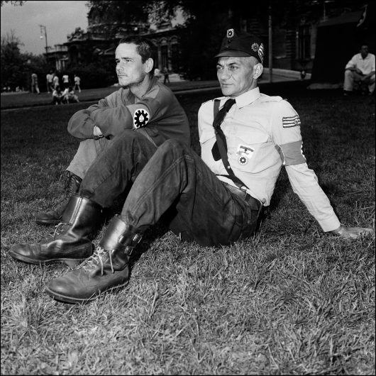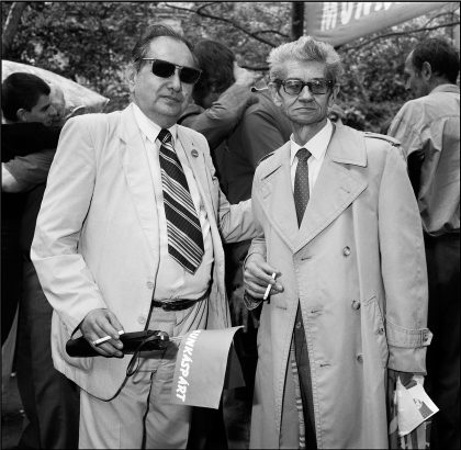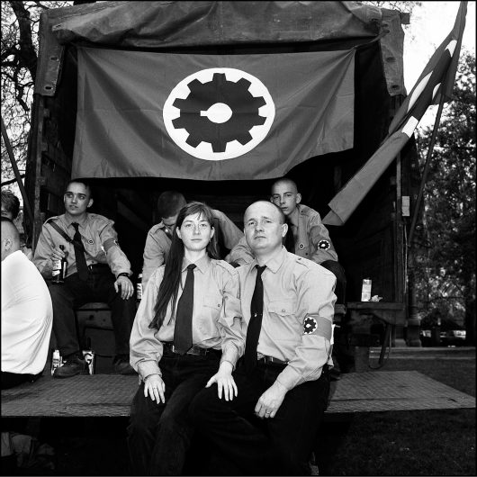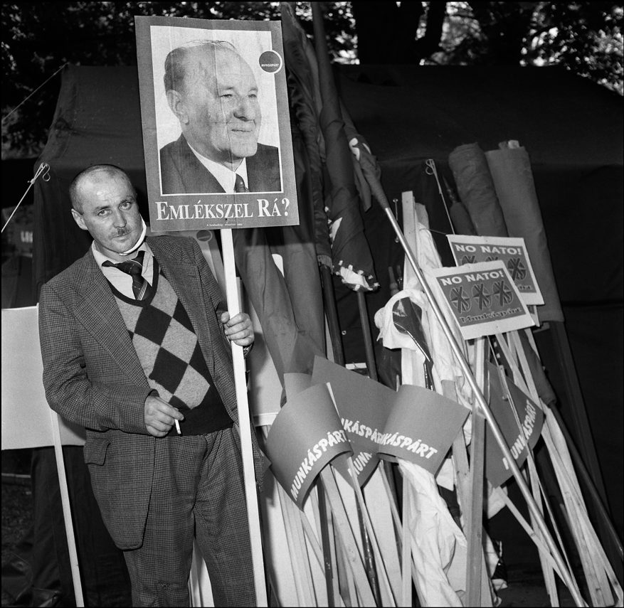 Péter Rákosi photographed political demonstrations in the new Hungary, after the fall of communism. He chose dates on which the achievements of the communist and fascist past were celebrated, such as March 15, October 23 and May 1. The original meaning of the dates is related to revolution and class struggle. After 1989 these were however generally exchanged for contemporary concerns. Only the old iconography continued to exist. In this way the demonstrators presented themselves as relics of the past and as the losers of the post-communist era. With his ‘post-historic’ series LEFT-RIGHT Rákosi wants to definitively bury the past.