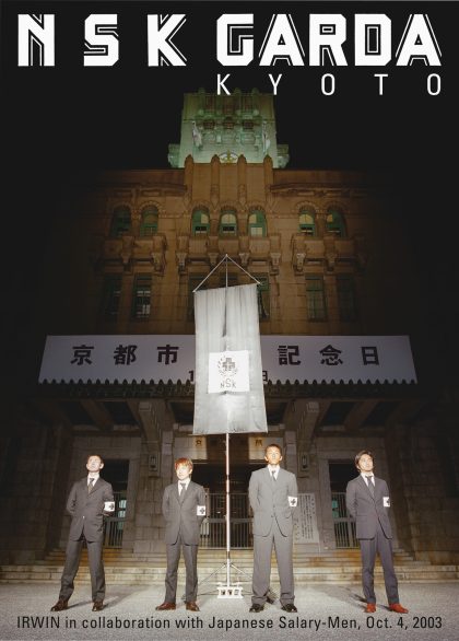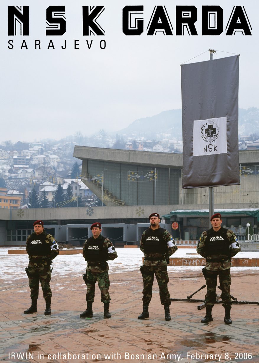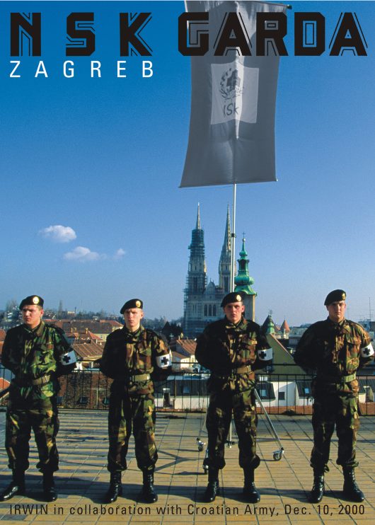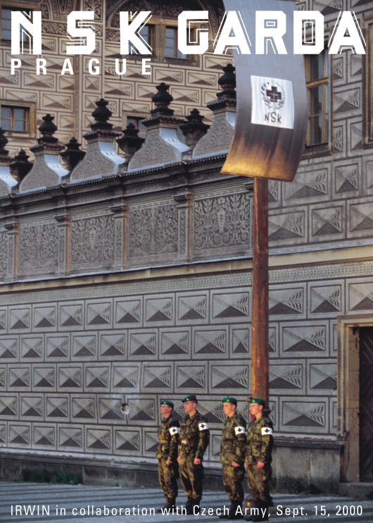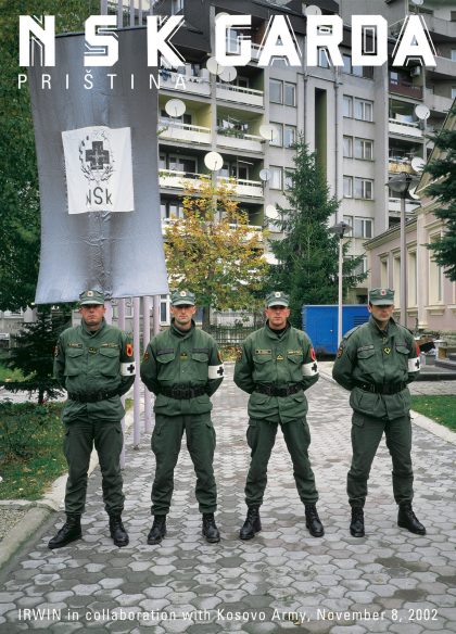 Since 1997 the Slovenian art group Irwin has been photographing real soldiers before the flag of the imaginary NSK state. Soldiers from Albania were first, followed by others from Croatia, Italy, Austria and the Czech Republic. Today the counter stands at twelve different armies. NSK stands for Neue Slowenische Kunst (New Slovenian Art), an alliance that began to attract followers in Eastern Europe in the 1980s. In addition to Irwin the music group Laibach, the theatre group Sester Scipion Nasice and the designers’ collective New Collectivism were part of NSK. The German name was deliberately chosen (as was Laibach, the name the Nazis gave to Ljubljana) in order to emphasise the traditional influence of Germany on Slovenian art, culture and history. This influence was precisely what the communist regime in Yugoslavia denied. Like the Balkan states during the civil war in Yugoslavia, NSK is a virtual state, but one with its own passports, a flag, insignia, consultants, and an embassy. The NSK symbol is derived from the swastika and the black cross of the Russian artist Malevich.