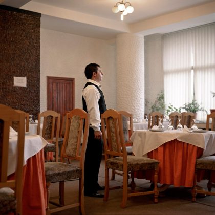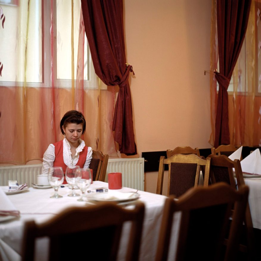 As a brand new member of the European Union, Romania has great expectations for Western tourism. But as of yet the flood of holiday-makers has failed to materialise. Many large restaurants, set up by hopeful entrepreneurs, are left with tables spread but no diners. At the most, the space is filled by noisy ‘turbo-folk beat’ coming from crackly loudspeakers or a showy flatscreen TV. The staff is comprised largely of young people who were born after the revolution. They kill time by SMSing, smoking cigarettes and staring emptily into space. Irma Bulkens portrayed this younger generation of Romanians, for whom the heritage of communism consists primarily of waiting.