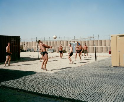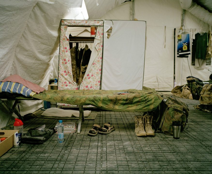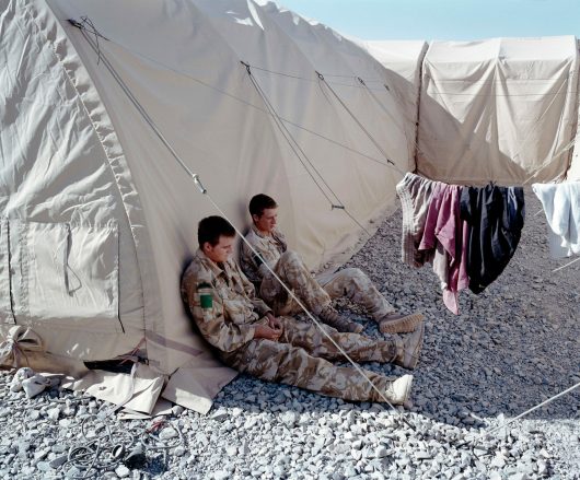 For nearly nine years now British troops have been fighting against the Taliban in Afghanistan. By now names like Kandahar and Helmand are as familiar to our ears as is the words ‘roadside bomb’. However, Kalpesh Lathigra is not interested in combat operations. He wants to know what makes the lives of soldiers in a war zone possible. Lathigra shows us well-lighted tents with air conditioning, hot showers and spotless, stainless steel toilets. Except for the sky, and an occasional translator, there is nothing Afghan to be seen. Not even any dust.