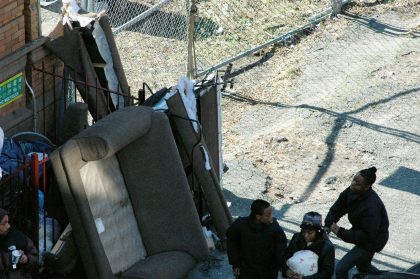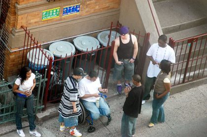 For five years Nadja Groux photographed the same street corner in New York, from the window of her apartment on the fifth storey. What began as a game – stealing moments – grow into a consistent series of street scenes that took place on the corner of 127th Street and St. Nicholas Terrace in Harlem. With her series, arranged like a story board, Groux, both an artist and a social anthropologist, exposes the diverse forms of observation and control in the neighbourhood: from police helicopters and security cameras to the drug dealer’s ‘footsoldiers’ guarding their territory, the photographer’s secret gaze, and ultimately, our gaze.