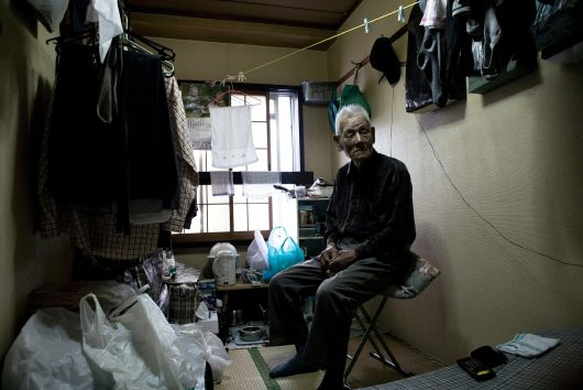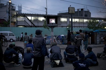 Only three metro stations for the chic business district of Japan’s second city, Osaka, lie in the Kamagasaki district. Although twenty thousand people live there, the district is not to be found on any city maps. It is a slum and a blot on Japanese society. Kamagasaki is largely populated by men over the age of 55, without homes, jobs or dignity, abandoned by their families, victims of alcoholism, and prey for organised crime and Christian charitable organisations. The pride of the Japanese reconstruction and urbanisation of yore pines away on less than a square kilometre, while the rest of the city roars ahead in a hectic industrial, capitalistic and technologically advanced consumerism.
