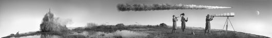 The seed for THE APOLLO PROPHECIES was planted during a period at Toni Morrison’s Atelier Program at Princeton University. It resulted, years later, in a uninterrupted panoramic black and white photo half a metre high and thirty metres long. On it we see astronauts from the 1960s, who once on the moon discover an expedition from the early 20th century which was supposed to have been lost. Kahn and Selesnick made use of miniatures and real actors, who come together in a story with different episodes, composed with a narrative technique reminiscent of religious frescos.