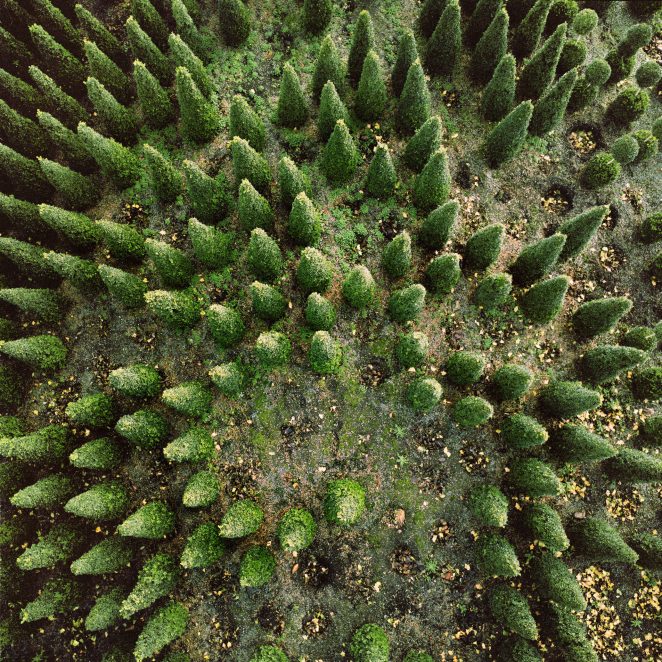In BAUMSCHULE Gerco de Ruijter plays with the sharply defined agricultural landscapes of tree farms. Small deviations stand out in the rigid rhythms of the rows of trees – and it is precisely these deviations which assure that we are again aware of nature. ALMOST NATURE was done in an evergreen nursery in Boskoop, South Holland. Each plant there is a clone, so that each colour represents a different original source. They are, De Ruijter observes, the equivalent of the photographic pixel.