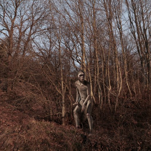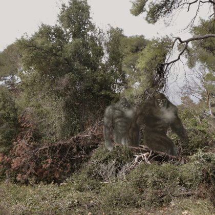 Two media come together in GONG: the series comprises a range of painted entities that are placed in photographed landscapes. The mythic figures call up associations with a world after a nuclear war, or with an extreme degree of evolution in which mankind has ceased to play a role. Apostolidou describes the beings, painted in a naive style, as forlorn, out of their element and melancholy. They are the visualization of the forgotten animal side of man.