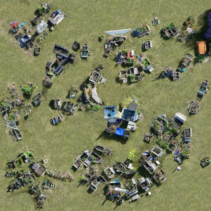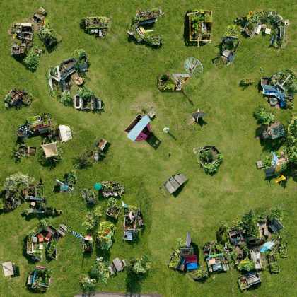On the decommissoned Tempelhof Airport in Berlin small collectives are seeking alternatives for the globalized food industry. With their vegetable gardens they reinforce the consciousness of the sources of food and strengthen social and cultural integration. Katharina Fitz recorded their garden plots through the four seasons. Each season produced hundreds of separate photos taken from three metres up, which were assembled into one image. In that way Urban Gardening Patchwork visualizes the power each individual has to break through established structures.