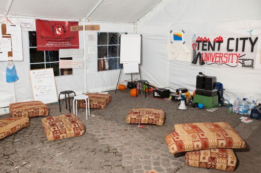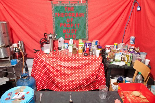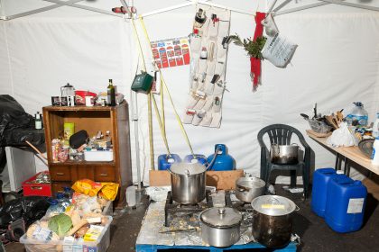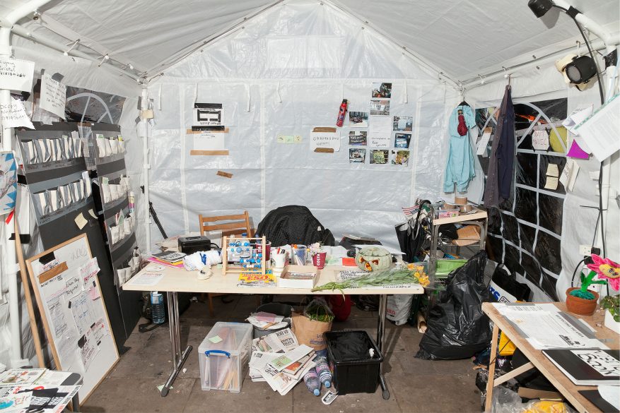 In October, 2011, the international Occupy movement set up a semi-permanent camp near St Paul’s Cathedral in London. Ten days later the British media reported that thermographic photos showed that people were present overnight in only 25 of the 250 tents on the square in front of the cathedral. The photographer Ben Roberts did not trust this reporting, and recorded the tent camp. He photographed the communal and private accommodations for the five months they stood on the square. The evidence of activity and residence offered proof of the intensive use of the limited space by a large number of permanent and temporary residents.