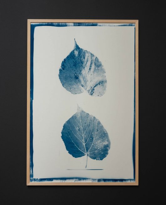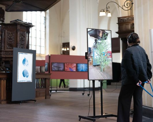 Opposite a cyanotype print, two screens display video feeds of the space with the image of a small, naked tree trunk inhabiting the installation virtually in augmented reality. When an audience is before the screen, the tree senses their presence and gradually starts to grow. Eventually, it gains leaves and takes over most of the image. As the audience moves away, the tree slowly wilts and shrinks back to its original size.