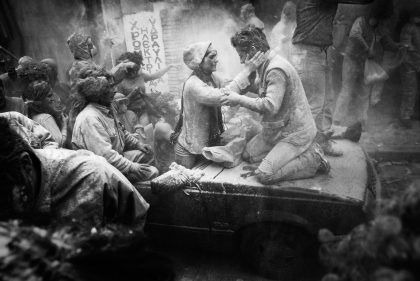 Als speelse tegenhanger van hun series over echte rampen en andere humanitaire onderwerpen fotografeerde het Tsjechische duo Alena Dvorakova en Viktor Fischer ‘oorlogshandelingen’ in het ontwikkelde Europa. In het besef dat vooruitgang onlosmakelijk met conflict en revolutie is verbonden, geven ze met An Hour of War de suggestie van apocalyptische beelden. In werkelijkheid gaat het om foto’s van het Griekse religieuze feest ‘Clean Monday’, waarbij deelnemers elkaar met bloem bombarderen.