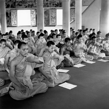 Hans Georg Berger fotografeert overal ter wereld religies volgens het ideaal van Joseph Beuys. Deze wilde als kunstenaar deel uitmaken van zijn onderwerp. In Laos werkt Berger al veertien jaar aan een serie over het boeddhisme, in nauwe samenwerking met de monniken van Luang Prabang. The Floating Buddha belicht de meditatielessen aan vijfhonderd jonge monniken in twee in het bos gelegen trainingscentra. Het boeddhisme in Laos ondergaat de laatste jaren een renaissance, en deze jonge monniken komen voor het eerst in aanraking met meditatietechnieken die zijn gericht op rust, inzicht en zelfbewustzijn. – Wandelende meditatie nr. 7. Vat Nagn Sakeo, Luang Prabang. 2004.
