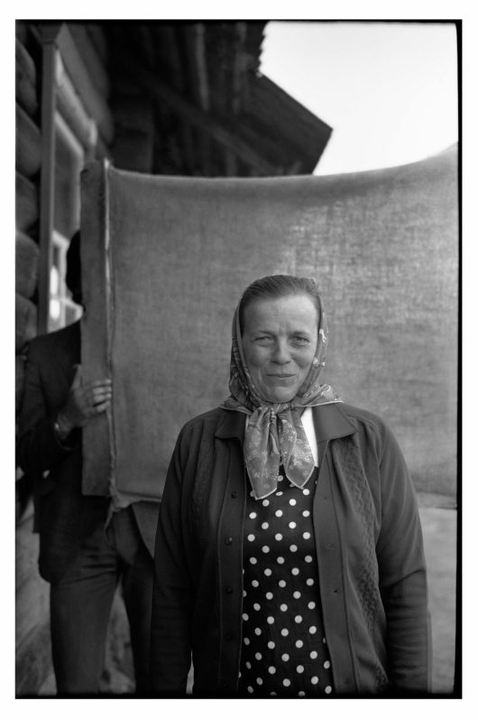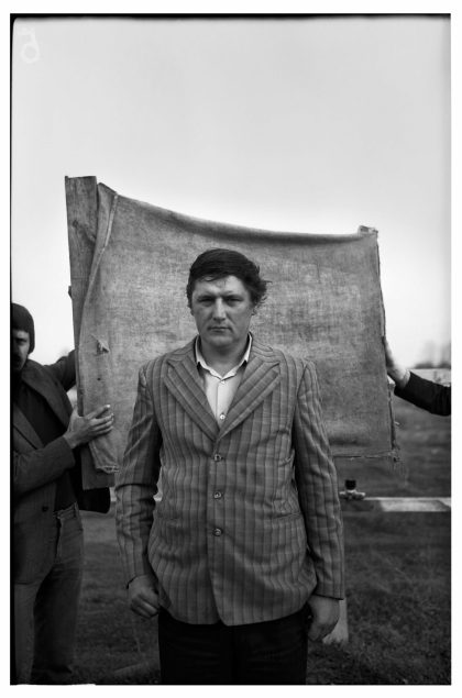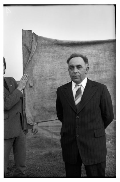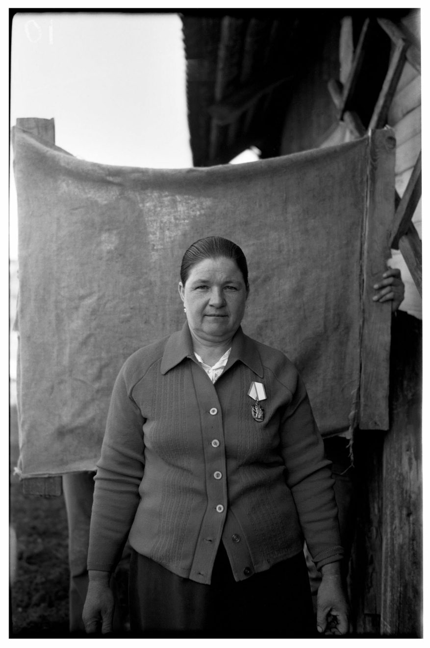 In 1980 Vladimir Shakhlevich photographed the leaders of the Red Banner collective farm. The photographs were intended for an honour roll, and were made close to their homes or in the subject’s workplace. The photographs show serious, proud men clad in their neatest clothing. Some wear a medal for their services to labour. A drape is held up behind them, intended to provide a uniform background after the print is cropped. In 1989 Shakhlevich reprinted the photos, without cropping them. Thus one can see where and how the photos were made, and the emphasis shifts to their constructed character.