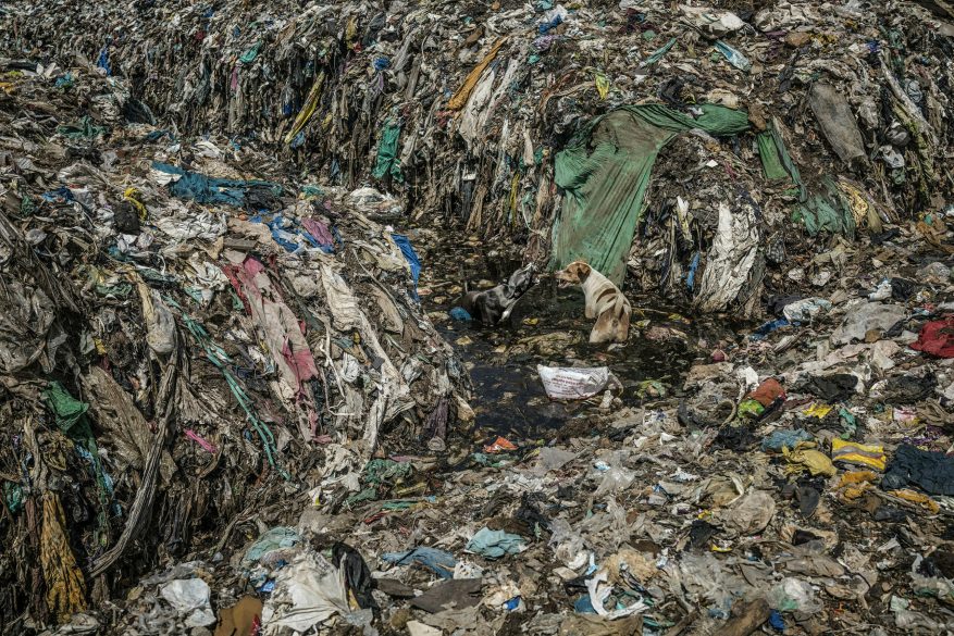 De foto toont zwerfhonden in Chennai die op een vuilnisbelt in vervuild water staan. Het water, vervuild door chemicalien uit plastic en door het rioolwater, zal uiteindelijk uitkomen in de Golf van Bengalen en daar gevolgen hebben voor de vis die er gevangen wordt.
