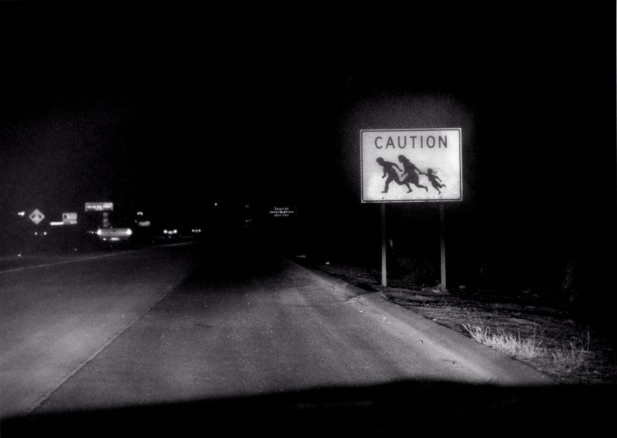 Een wrang bord nabij de Mexicaans-Amerikaanse maakt automobilisten attent op het gevaar van overstekende illegalen.