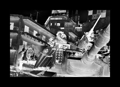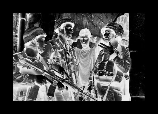 Rula Halawani (Palestina, 1964) groeide op de Westelijke Jordaanoever op. Ze herinnert het zich als een gebied waar oude dorpjes versmolten met een prachtig heuvellandschap. Nu ziet ze vooral de lelijke bouwsels van Israëlische kolonisten. Met haar foto’s van de West Bank (IRRATIONAL) wil ze haar volk de kracht geven om te blijven dromen van een vredig Palestina. De aanwezigheid van de Israëli’s heeft ook de Palestijnse stad Ramallah onherkenbaar gemaakt. Op de dag van de Israëlische inval, de incursion, van 28 maart 2002 zag Halawani er straten die slechts werden bevolkt door Israëlische soldaten en tanks. De enige Palestijn die ze aantrof was een doodgeschoten oude man, wiens gezicht ze niet meer uit haar hoofd kon zetten. Ze vertaalde haar gevoel in NEGATIVE INCURSIONS, een serie in negatief afgedrukte foto’s van de inval in Ramallah.