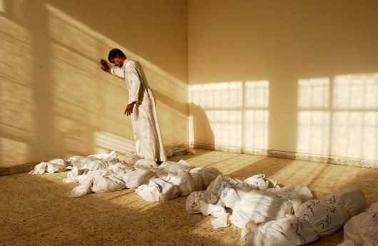 Zeven maanden verbleef fotograaf Benjamin Lowy – of zoals hij zelf zegt journalist, kunstenaar en verhalenverteller – in Irak om de Amerikaanse inval te documenteren. Hij trok op met de geallieerde strijdkrachten, mengde zich onder de Irakese bevolking en onderging een mortieraanval op een Amerikaanse basis in Koeweit. Niet zelden maakte Lowy zijn foto’s met trillende handen of betraande ogen. Het meest onder de indruk was hij van een sjiietisch gezin dat in een massagraf een aantal familieleden terugvond dat in 1991 door het regime van Saddam Hoessein was geëxecuteerd. Pas na enkele andere opgravingen wist Lowy zich zodanig te herstellen dat hij weer kon fotograferen.