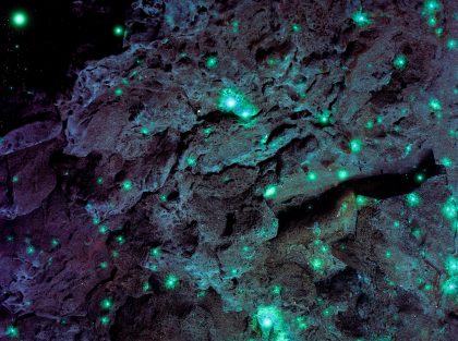 Binnen een vulkanisch netwerk, diep onder de Atlantische Oceaan, ontstaan fotografische afdrukken zonder menselijke tussenkomst. De locatie, de Triple Junction, is een uitzonderlijk geologisch kruispunt waar drie tektonische platen uit elkaar schuiven en waar onderaardse tunnels vol zeldzame metalen, bacteriën en mineralen ontstaan. Deze natuurlijke schachten functioneren als levende camera’s: vocht, temperatuur, chemische reacties en trillingen van menselijke activiteit laten hun sporen achter op fotografische negatieven die Louis er heeft achtergelaten. De ‘selfies’ die zo ontstaan, combineren geologische tijd en menselijke invloeden tot een nieuw soort beeldtaal.