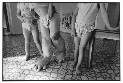 In 1986 explodeerde een nucleaire reactor in Tsjernobyl. Honderdnegentig ton radioactieve stoffen vergiftigde een kwart van de Russische bevolking en het Russische landschap. Nog altijd zijn de sporen zichtbaar. Veel Russen worden ziek van de radioactieve stoffen die zij dagelijks met hun voedsel en drinkwater binnenkrijgen. Een nieuwe generatie kampt met een scala van fysieke, neurologische en psychologische aandoeningen. Paul Fusco fotografeerde het dagelijks leven in het getroffen gebied voor Chernobyl Radiation (1997). Hij richtte zich vooral op de kinderopvang in Minsk. Daar komen veel baby’s terecht die zo misvormd zijn dat hun ouders ze niet meer willen hebben. Hoewel de kerncentrale van Tsjernobyl in staal en beton is verpakt, lekt deze nog altijd radioactieve stoffen.