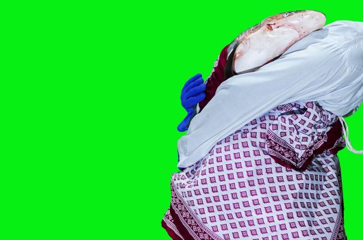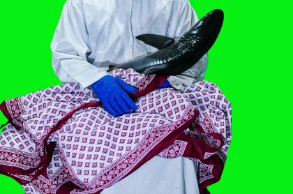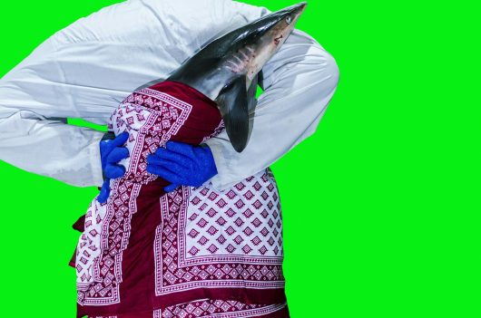 Kelvin Haizel reisde naar de Comoren, nadat hij voor het eerst van deze archipel in de Indische Oceaan hoorde via de documentaire ‘Island of Death’. De eilanden, die zelfs op een groot aantal geografische kaarten niet worden vermeld, kwamen in 1996 in het nieuws toen een gekaapt vliegtuig van Ethiopian Airlines voor hun kust neerstortte. Ruim 100 mensen kwamen om en hun lichamen werden ondergebracht in de enige koelcel van het eiland, dat daarmee een belangrijke bron van inkomsten verloor. Geïnspireerd door de politieke poster van een Comorese activist (die laat zien hoe immigranten door een haai worden verscheurd tijdens een poging over te steken naar het door Frankrijk bezette Comoren-eiland Mayotte), maakte Haizel in de inmiddels ter ziele gegane koelcel deze performance-achtige fotoserie met een babyhaai. Zo combineert hij beide drama’s, die voor hem de tragedie van de hele vergeten regio weerspiegelen.