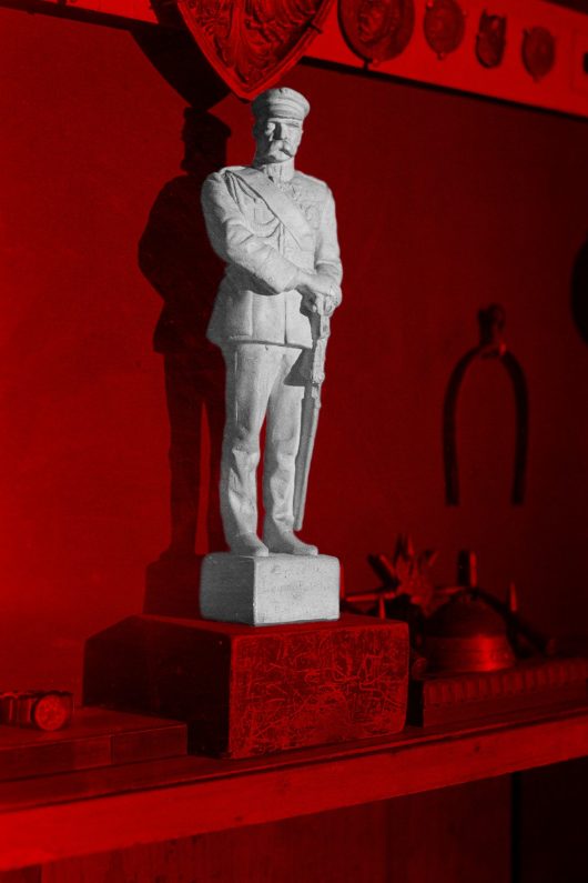 Józef Piłsudski (1867-1935) leidde Polen in 1918 voor het eerst in 123 jaar weer naar volledige onafhankelijkheid. Dit leidde tot een enorme persoonlijkheidscultus, die officieel onderdeel werd van de ideologie van de Poolse staat. Zijn carrière kende een fascinerende tweedeling: van jonge, anti-tsaristische rebel, die verbeten tegen het Russische rijk vocht, tot diepgeworteld onderdeel van het establishment, waartegen anderen in opstand zouden komen. De Poolse kunstenaar Oktawian Jurczykowski combineert archief- met eigen beelden om de cultus rond Piłsudski in de context van het hedendaagse Polen te plaatsen. Het ‘rood’ uit de titel refereert tweeledig aan de Poolse legende: hij vocht tegen Sovjet-agressie, maar regeerde Polen later op een manier die deed denken aan het regime. En fotografisch gezien is rood een felle kleur, maar omgezet naar grijswaarden is de waarde donker.