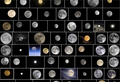 Penelope Umbrico gebruikte Flickr, een website om foto’s en video’s te delen, om te onderzoeken hoe de volle maan wordt gefotografeerd en de foto’s worden gedeeld. Hoewel er dure, gespecialiseerde apparatuur voor nodig is om een heldere, scherpe foto van een volle maan te maken, vond Umbrico tot haar verbazing op Flickr maar liefst 1.146.034 identieke, technisch goede foto’s, velen ervan paradoxaal genoeg voorzien van een ‘alle rechten voorbehouden’-label. Zo benoemt Umbrico de verschuivingen in betekenis en waarde die optreden wanneer de individuele, subjectieve ervaring van het getuigen en fotograferen wordt ontmaskerd als een collectieve praktijk, die hier weer in een compleet nieuwe context wordt geplaatst. Twee delen van het werk worden gepresenteerd: Everyone’s Moon 2015-11-04 14.22.59 is een video die in een razend tempo door de manen scrolt en Screenshot 2015-11-04 14.22.59 is een eraan gepaarde elf meter lange print.