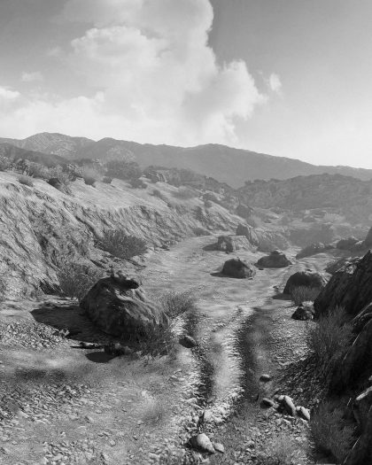 In reality, he scours video games in search of the scenery behind the game, which he saves as screenshots. His final photorealistic images emerge as a collage of the manifold details that he captures in this way.