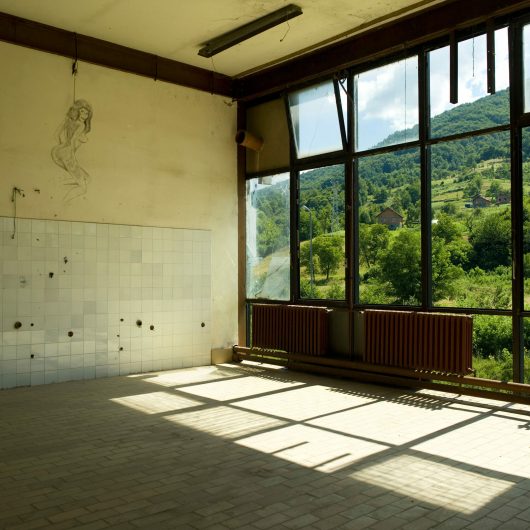 Dutchbat, het Nederlandse bataljon van UNPROFOR, de vredesmacht voor voormalig Joegoslavië, zal voor altijd verbonden zijn met de dood van 7500 moslimmannen. Overlopen door de Bosnisch-Servische troepen van Ratko Mladíc en beperkt door een onvolledig mandaat, werkte Dutchbat in de ‘veilige’ enclave Srebrenica mee aan het scheiden van moslimmannen en -vrouwen. De mannen bleken na deportatie door Mladíc’ troepen te zijn vermoord. Sake Elzinga fotografeerde meer dan een decennium na de val de verlaten gebouwen van de voormalige Dutchbat-basis in Portocari, vlakbij Srebrenica. Het zijn verstilde beelden – sereen, maar met de ondertoon van een schuldig verleden.